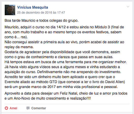 Sou médico, já tentei implantar 3 softwares na minha clínica mas nenhum conseguiu me convencer que seria melhor que os gráficos que criei para descrever as cirurgias de maneira rápida e objetiva, e para minha surpresa eu consegui com o Evernote o que eu procurava, isto é, o software me permite usar os meus próprios conceitos organizacionais. As dificuldades que tive até agora vão aos poucos sendo dissipadas com auxílio do curso. O vídeo a que tive acesso demonstrou a sua didática e o conhecimento das amplas possibilidades do Evernote, e daí a minha decisão sobre o curso que atendeu às expectativas e aspirações.