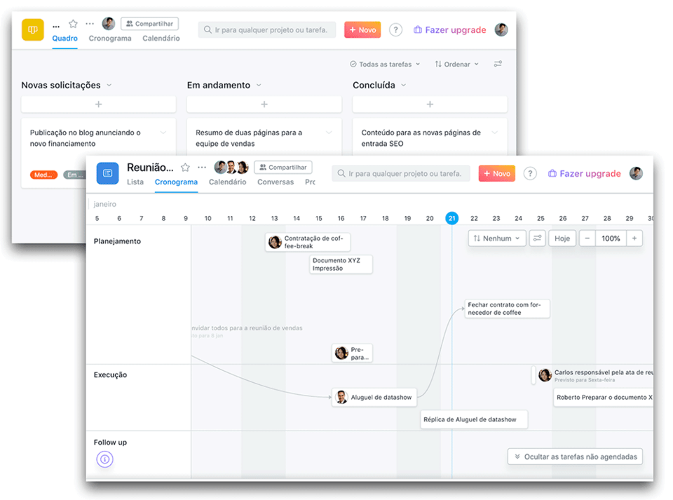 Você pode eliminar os cronogramas desatualizados, as perdas de tempo com cobranças de status da equipe e a desorganização dos documentos/arquivos.