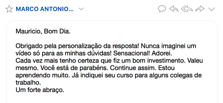 Mauricio, apesar de várias informações gratuitas na Internet, você me conquistou a investir no seu Treinamento por tudo que você propõe a compartilhar passando-me confiança e estímulos para conhecer melhor o aplicativo.Parabéns pelo seu trabalho e dedicação na qualidade do treinamento.