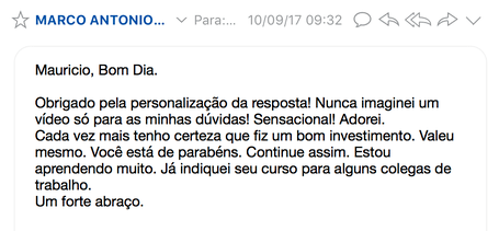 Mauricio, apesar de várias informações gratuitas na Internet, você me conquistou a investir no seu Treinamento por tudo que você propõe a compartilhar passando-me confiança e estímulos para conhecer melhor o aplicativo.Parabéns pelo seu trabalho e dedicação na qualidade do treinamento.