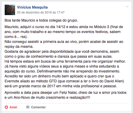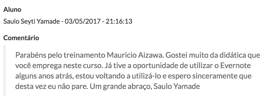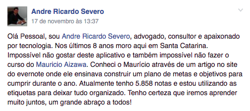 Uso há muito tempo o Evernote, nem lembro o porque comecei a usá-lo, mas senti a necessidade em organizar as minhas coisas, vida pessoal, afazeres profissional, projeto, reunir informações em um único lugar. Sem querer pesquisando sobre treinamento de Evernote encontrei o Mauricio que estava transmitindo um webinar, no fim da transmissão comprei o curso e iniciei o treinamento.